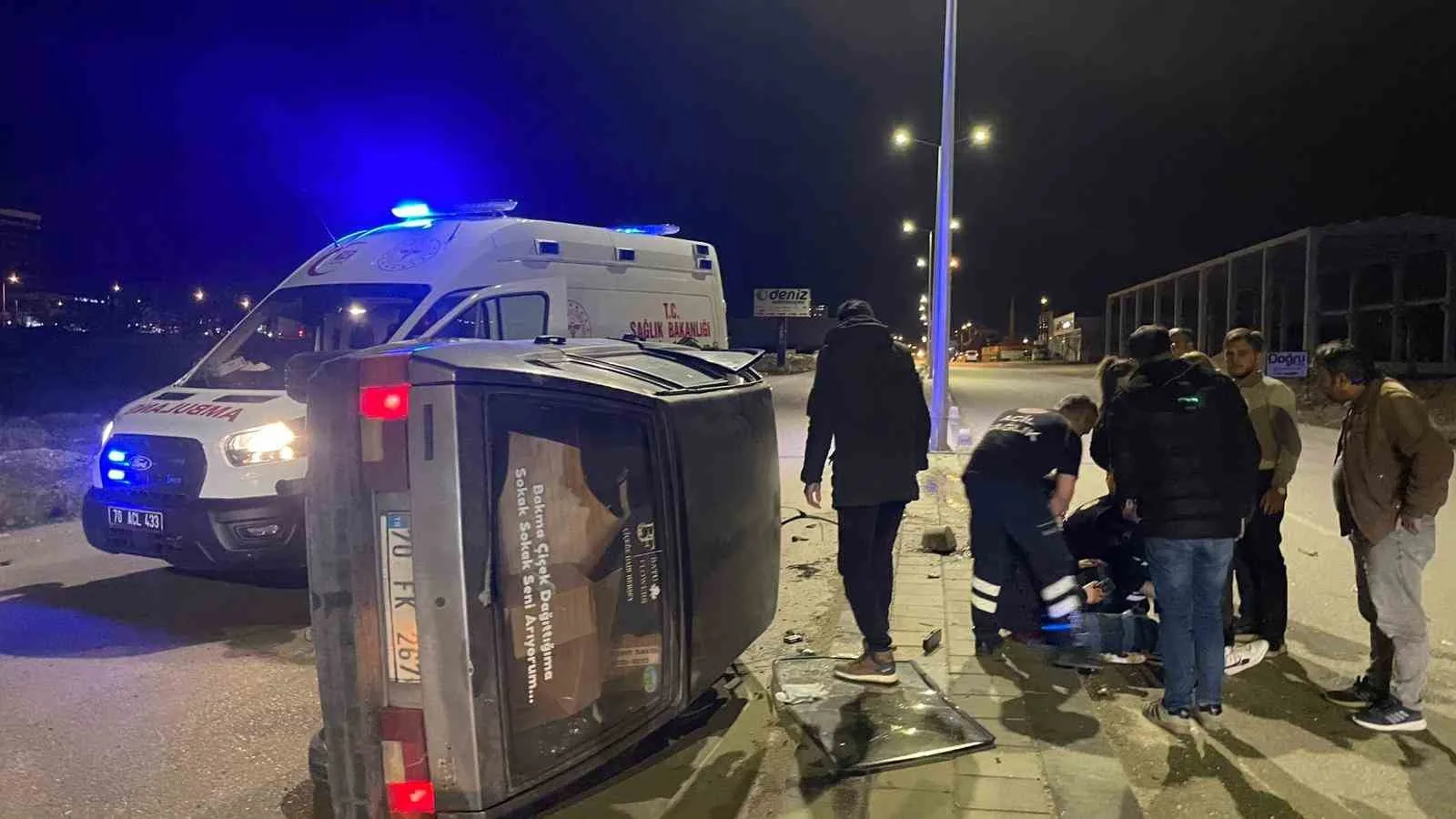 Karaman’da refüjdeki beton duba ile aydınlatma direğine çarpan otomobil kontrolden çıkarak yan yattı. Kazada 2 kişi hafif şekilde yaralanırken, kaza anı güvenlik kamerasına yansıdı.