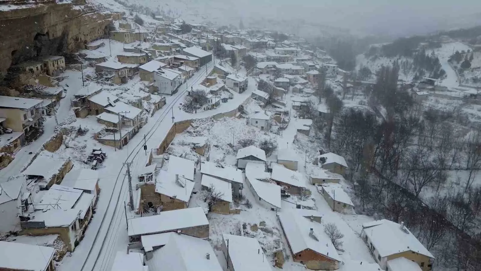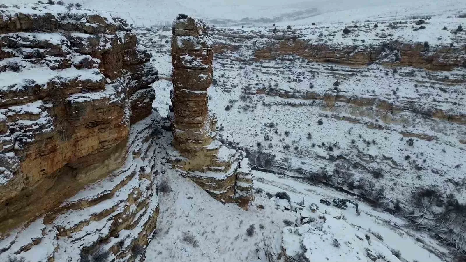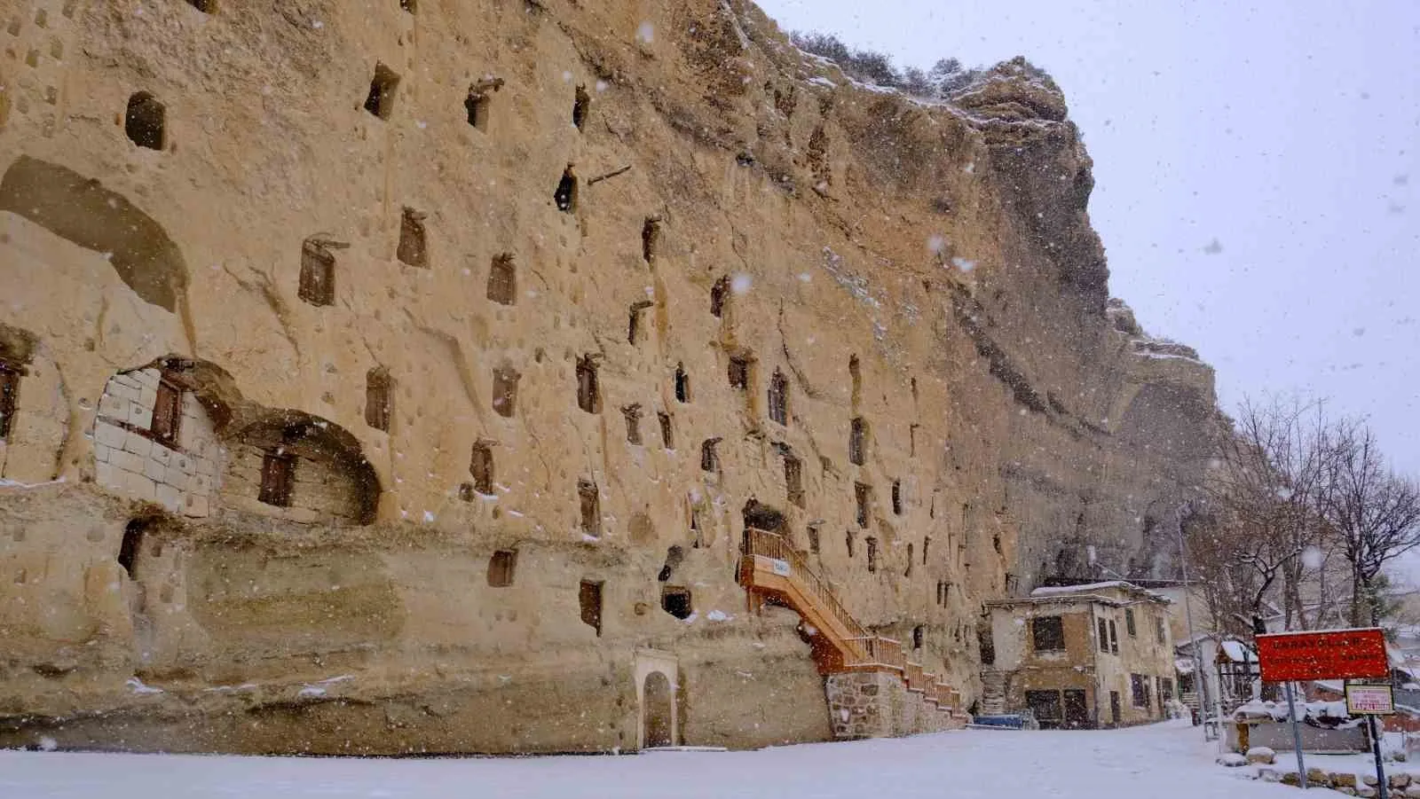 Karaman’da etkili olan kar yağışının ardından, kent genelinde tarihi ve doğal güzellikler beyaz örtüyle kaplanırken, ortaya adeta kartpostalları aratmayan manzaralar çıktı. Özellikle Karaman merkeze bağlı Taşkale köyünde bulunan ve geçmişi yüzyıllar öncesine dayanan Taşkale Tahıl Ambarları ve Manazan Mağaraları kar yağışıyla birlikte eşsiz bir görünüme kavuştu. Kayalara oyularak yapılan ve bölgenin önemli tarihi mirasları arasında yer alan tahıl ambarları, beyaz örtüyle bütünleşerek görsel bir şölen sundu. Manazan Mağaraları çevresinde oluşan kar manzarası, bölgeye gelen ziyaretçilerin ve fotoğraf tutkunlarının ilgisini çekti. Karla kaplanan tarihi yapılar, geçmiş ile doğanın eşsiz uyumunu bir kez daha gözler önüne serdi. Amerikan kovboy filmlerindeki kanyonları anımsatan yapısıyla bilinen Yeşildere kanyonu ise kar yağışıyla birlikte adeta görsel bir tabloya dönüştü. Kanyonun derin yapısı ve karla kaplanan kayalıkları, farklı açılardan kartpostallık görüntüler oluştururken, ortaya çıkan bu manzaralar havadan dron ile görüntülendi. Tarihi ve doğal zenginliğiyle dikkat çeken Taşkale köyü, yalnızca doğal güzellikleriyle değil, kültürel ve sanatsal geçmişiyle de öne çıkıyor. Köy, bugüne kadar birçok film ve belgesel çekimine ev sahipliği yaparak, sinema dünyasında da kendine yer buldu. Manzarasıyla her mevsim ayrı bir görsel şölen sunan Taşkale’de, Kurtlar Vadisi dizisinde Elif karakterini canlandıran ünlü sanatçı Özgü Namal’ın başrolünde yer aldığı ve 2007 yılında vizyona giren Mutluluk filminin bazı sahneleri de bu bölgede çekilmişti.