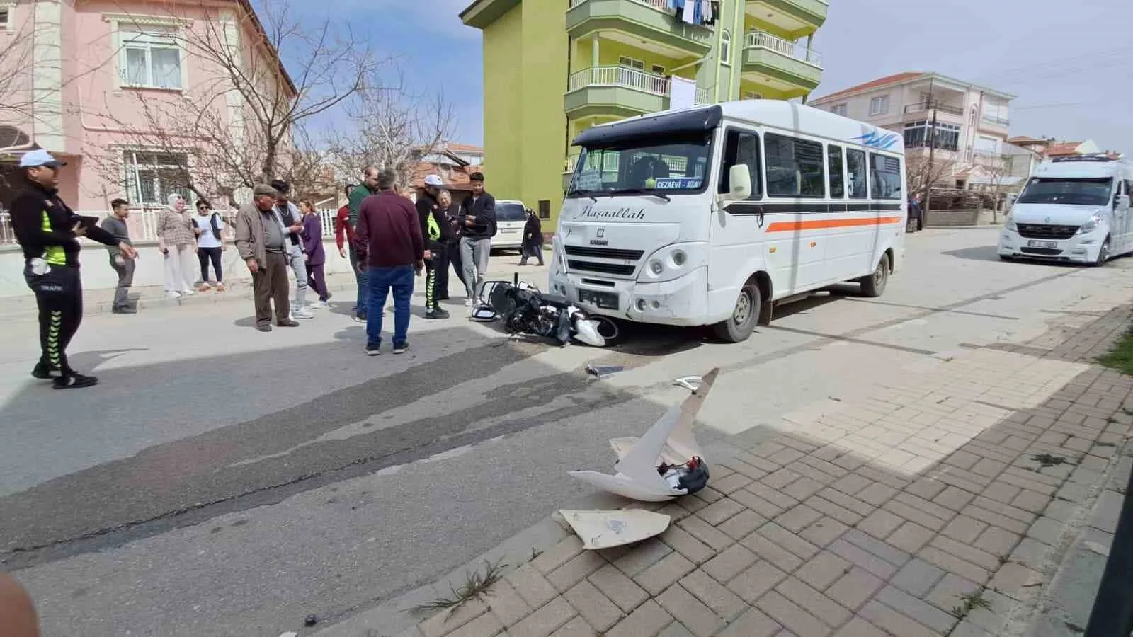 Çarpmanın etkisiyle elektrikli bisiklet yaklaşık 10 metre minibüsün altında sürüklendi. Kazada bisiklet sürücüsü H.C. ile arkasında yolcu olarak bulunan M.F.D. (16) ağır yaralandı.