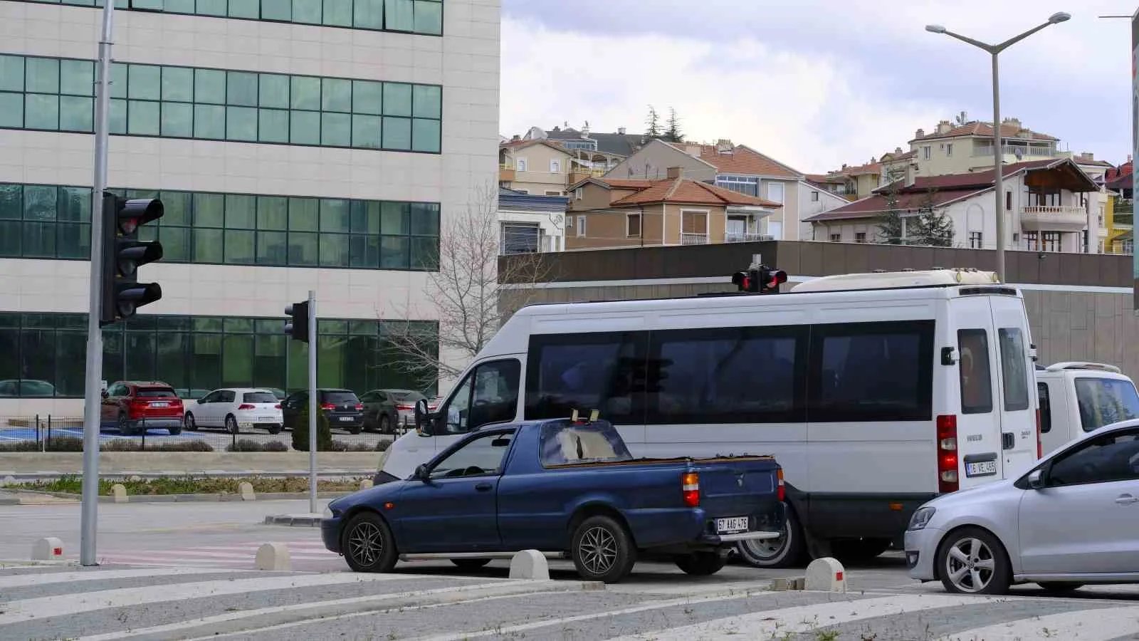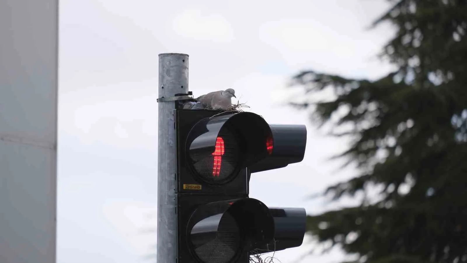 Karaman’da yoğun trafik akışının olduğu kavşakta trafik lambasına yuva yapan kumru, sürücülerin ilgisini çekti.