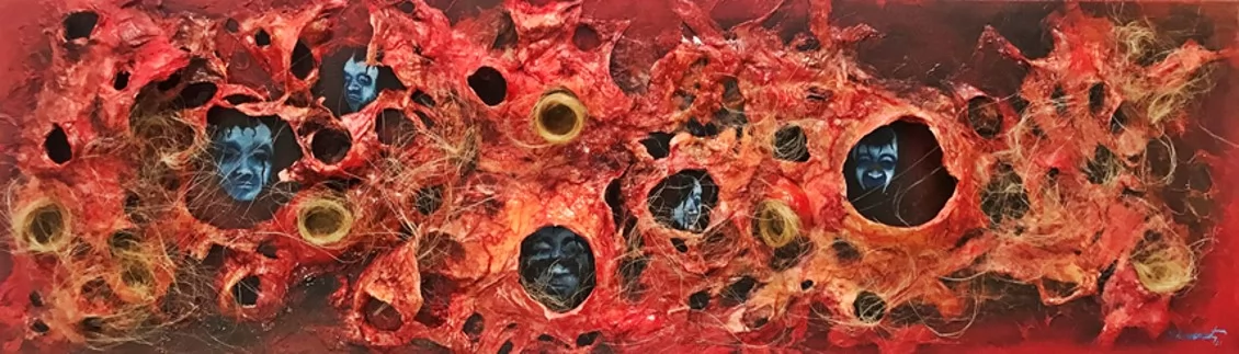 Serginin odak noktalarından biri olan “Mavi Ölüm Serisi – Orta Panel”, yapay zekâ aracılığıyla üretilen bir sesin sergi mekânına dâhil edilmesiyle izleyiciyi farklı bir deneyime davet ediyor. Yaşam sona ermiş olsa da, bedenin temsili bu yapay ses aracılığıyla varlığını sürdürürken, ölüm sonrası temsil ve bellek kavramları yeniden sorgulanıyor.